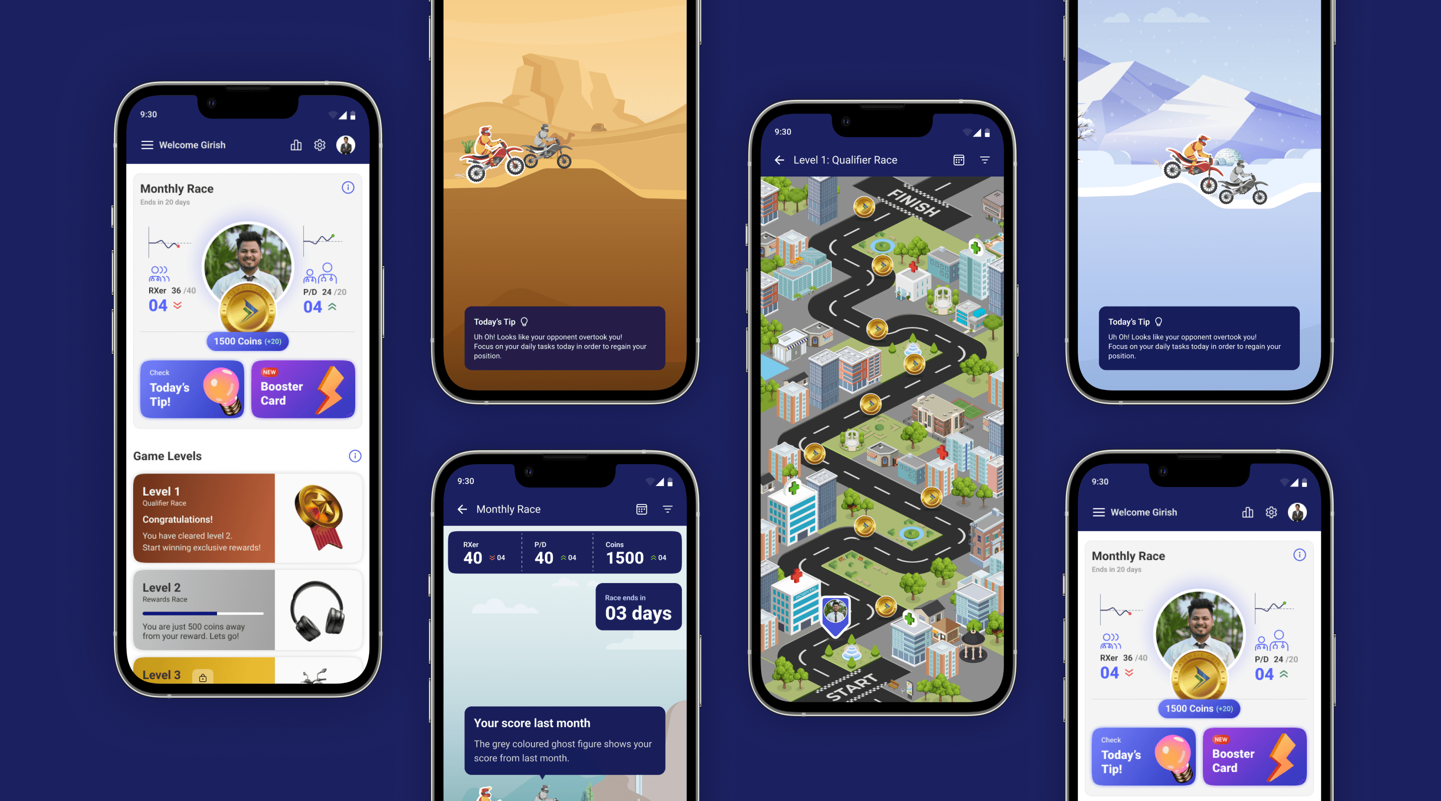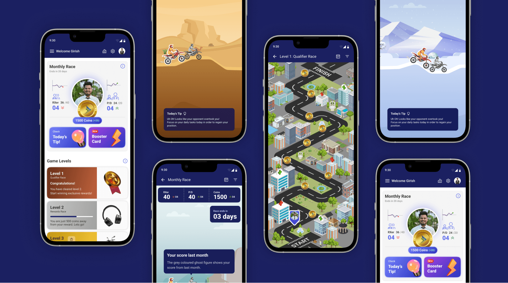 A dynamic, thematic race environment transformed daily progress into a visual journey. Each day feels new, playful, and engaging - breaking the monotony of data-heavy screens.